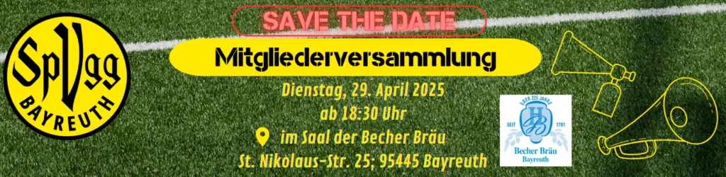 Die Mitgliederversammlung der Spielvereinigung Oberfranken Bayreuth e.V. findet am Dienstag, den 29. April 2025, ab 18.30 Uhr, im Saal der Becher Bräu, St.- Nikolaus-Straße 25, 95445 Bayreuth statt. Hierzu sind alle Mitglieder herzlich eingeladen.