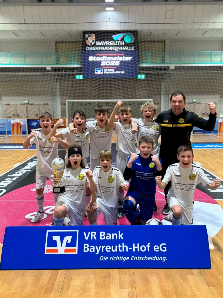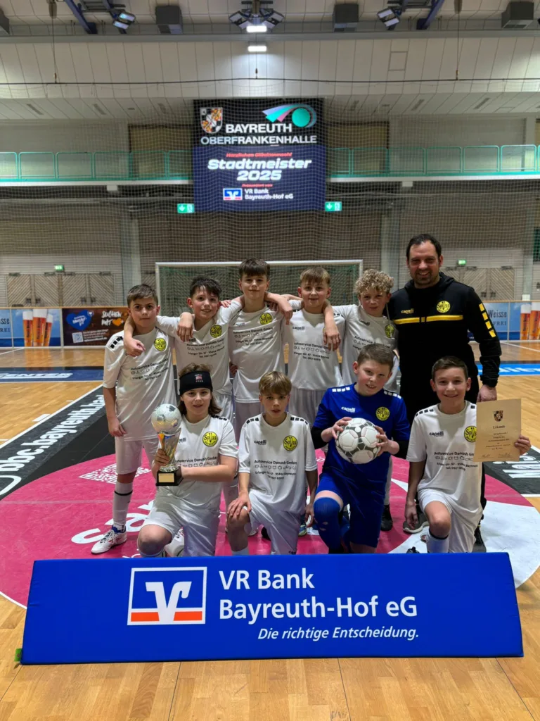 Am Samstg, den 08.02.2025 ist es unserer U12 gelungen, die Hallen-Stadtmeisterschaften der D-Jugend (U13) zu gewinnen. Insgesamt waren 12 Teams aus Bayreuth am Start, darunter auch die Teams unserer U12 und unserer U13. Beide Oldschdodteams konnten sich souverän in ihren jeweiligen Vorrundengruppen ohne Punktverlust durchsetzen. Die U13 konnte nach den drei Spielen der Gruppenphase sogar ein Torverhältnis von 33:0 vorweisen.