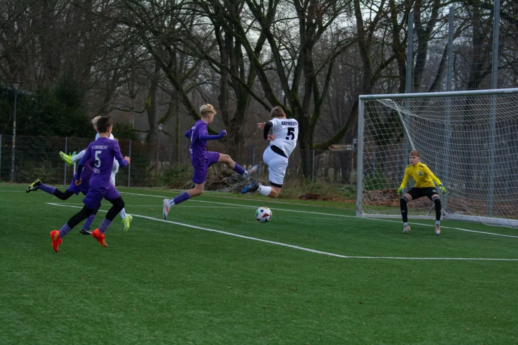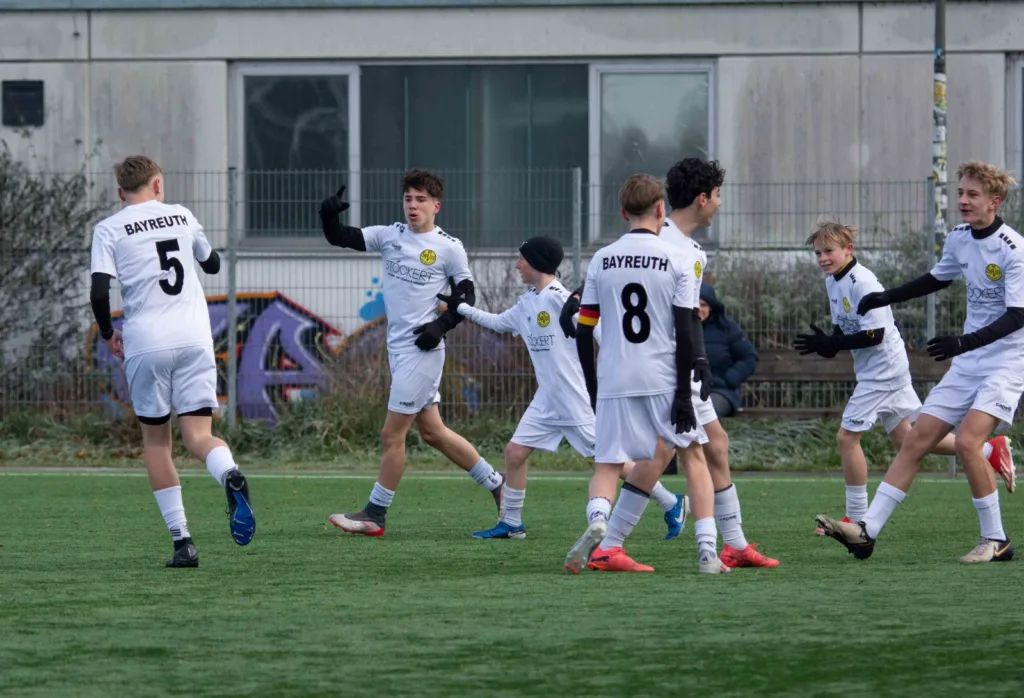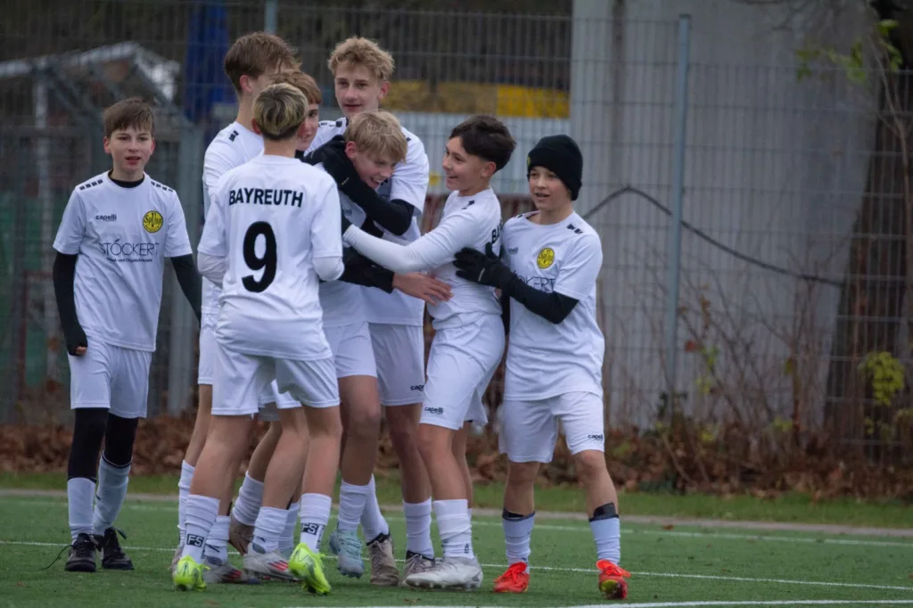 Am zurückliegenden Wochenende kam es zum Spitzenspiel unserer Jungs als Tabellenzweite gegen die auf dem dritten Tabellenplatz stehenden Gäste vom FC Eintracht Bamberg. Diese ließen in der Vorwoche aufhorchen, als sie den aktuellen Tabellenführer auf eigenem Platz mit 2:3 bezwangen. Gleich in den ersten Minuten des Spiels zeigten die Bayreuther, worauf es in diesem Spiel gegen körperlich und kämpferisch starke Gäste ankommen würde: Laufbereitschaft, Zweikampfstärke und sicheres Passspiel. Nach zunächst wenigen Torszenen beider Teams fand in der 11 Minute eine schöne Freistoßflanke der Heimelf am zweiten Pfosten einen Abnehmer, der den Ball mit dem Kopf im Tor unterbrachte. Mit weiteren Treffern zum 2:0 und 3:0 im zweiten und dritten Spieldrittel machten unsere Jungs in einem intensiven Spiel den „Deckel drauf“. Damit bleibt man nach dem letzten Spiel in diesem Jahr den Ansbachern im Kampf um die Tabellenführung auf den Fersen und überwintert mit 24 Punkten und einem Torverhältnis von 42:9 bei neun Spielen und einem ausstehenden Nachholspiel auf dem zweiten Tabellenplatz.